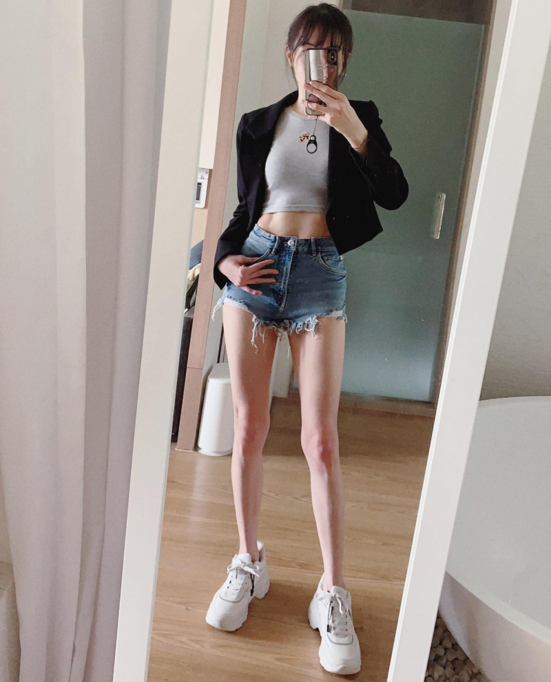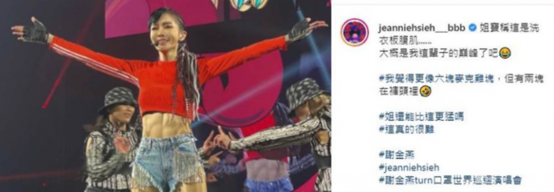 謝金燕難得曬出自拍秀身材,以短版上衣、牛仔熱褲入鏡的謝金燕,結實腹肌、一雙細長鉛筆腿全都露,好身材超養眼