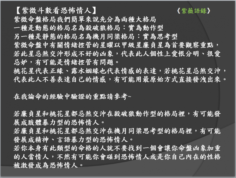 若廉貞星和桃花星都忌煞交沖在殺破狼動作型的格局裡,有可能發展成肢體暴力型的恐怖情人。