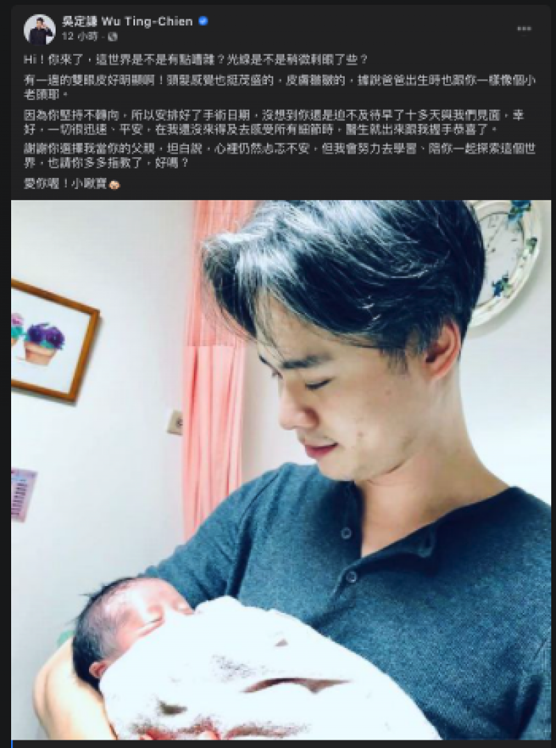 26日他透過臉書報喜,兒子「小啾寶」平安誕生,吳定謙也溫馨俏皮地對著剛出生的兒子說「請你多多指教」