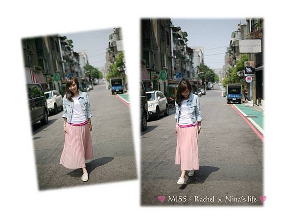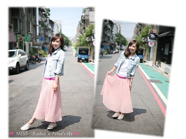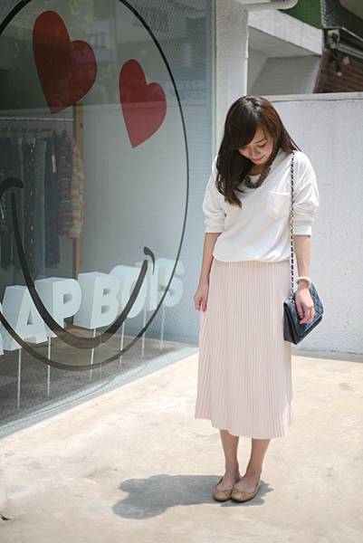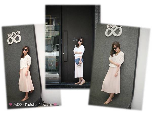 粉色款我搭配的白色類雪紡的上衣,以及帶些華麗感的項鍊,最後配上簡單的娃娃鞋