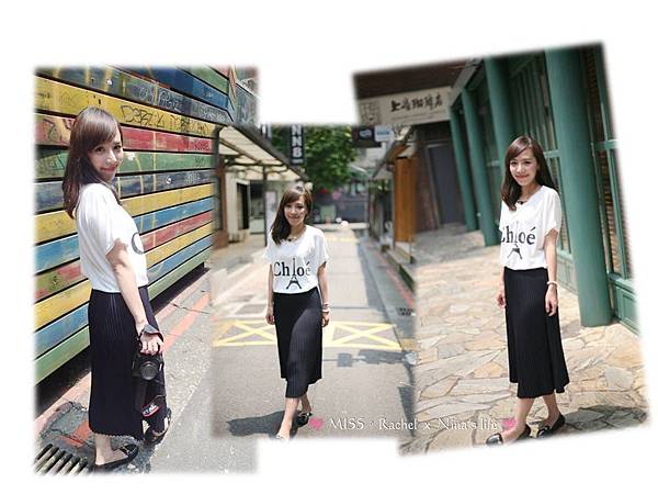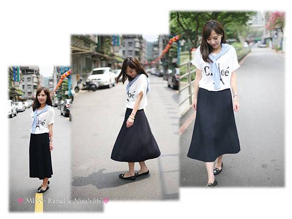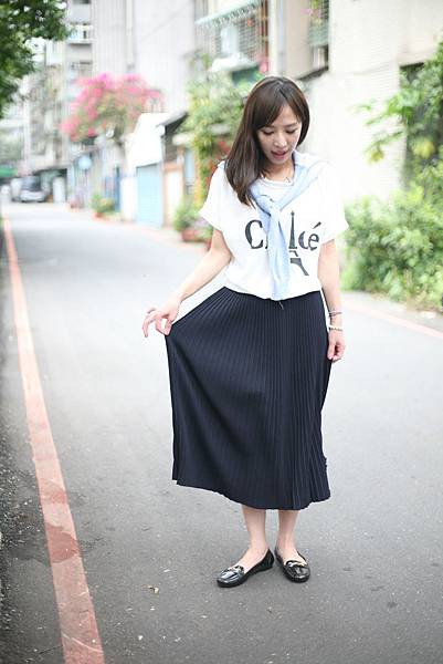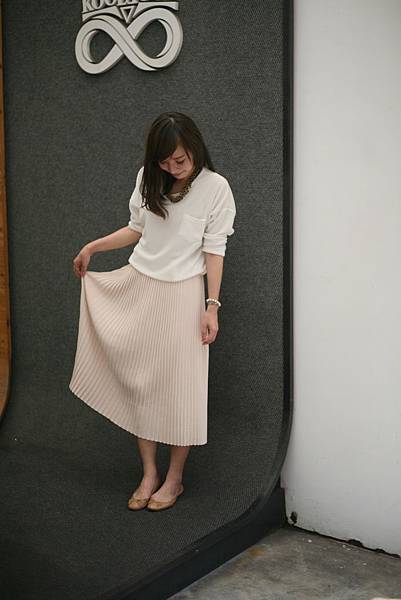 這款百褶裙的觸感相當好,而且很挺,白褶的褶痕比較細條,相對於雪紡材質多了份優雅