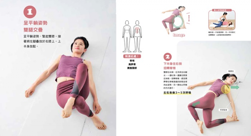 脊椎歪斜、彎腰駝背以及肩胛骨不靈活等都是造成肩膀僵硬的原因。請透過本方法靈活地紓緩脊椎,伸展軀幹。以圖片2為例,這是藉由左膝與左肩呈扭轉姿勢而且彼此拉鋸的方式來矯正脊椎的歪斜。手握住腳尖,與身體圈成一個圓亦為重點所在。圓的內側會全面受到刺激,因此圓愈大,矯正脊椎的力道就會愈大。