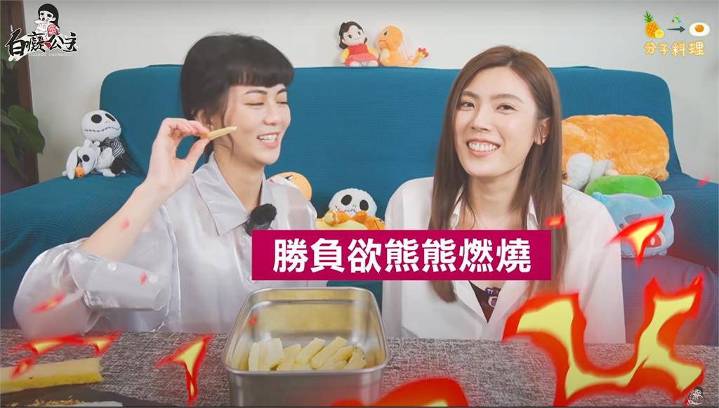 網紅「白癡公主」昨(30)日在Youtube頻道中,分享了最新的「小資少女不專業自理餐時間」企劃,這次邀請到百萬Youtuber「理科太太」一起製作分子料理,成功用鳳梨、水蜜桃還原出「太陽蛋」造型甜品。影片中笑料不斷,倆人互動曖昧,甚至還在小遊戲中猛咧親嘴!讓網友都害羞回應「化學反應很大」、「公主把太太打開了嗎?」、「有放閃的感覺」、「太太真的好攻!」留言區充滿粉紅泡泡。
