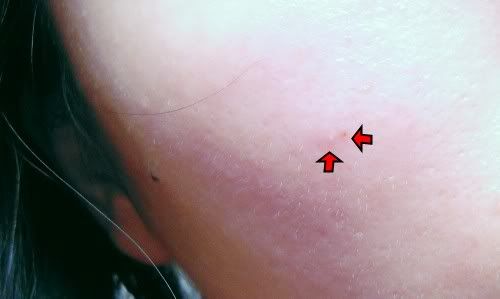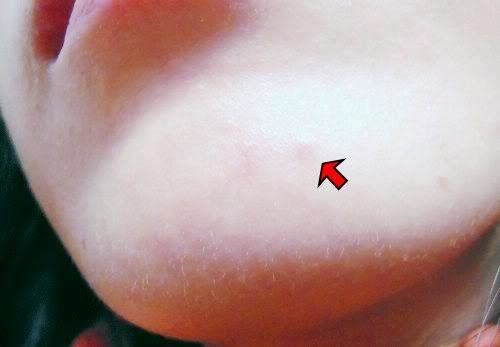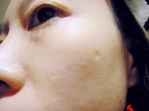 因為換季的關係 臉部靠近頸子的地方(右下角紅色箭頭處) 出現一些小顆粒