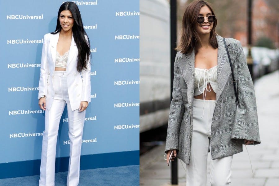 白色馬甲的女人味與正式感的西裝褲,衝撞出性感迷人的女性魅力!全身白穿搭自帶反光板,不需要過多裝飾就很搶眼,外罩西外打造剛柔衝突感,巧妙平衡、搭配出氣質爆棚的穿搭。好萊塢名人及名媛最愛搭白色緞面西外套裝(左),刷亮大家的眼睛,不費力營造豪門氣勢!