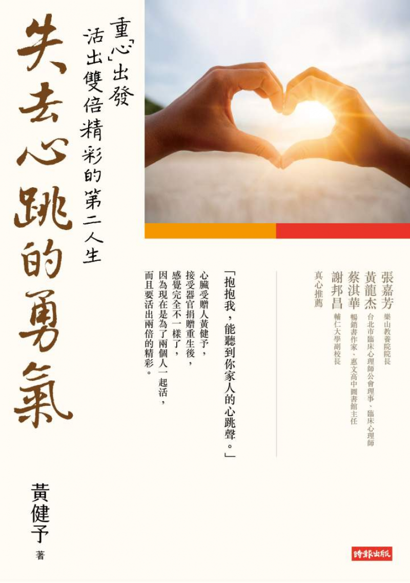 心臟受贈者黃健予幾年前就簽下器官捐贈同意書,簽署的當下是熱血熱心,但怎麼也沒想到自己還沒機會成為捐贈者,就先成為受贈者。心臟受贈者黃健予出版《失去心跳的勇氣》(時報出版)提到,2016年,才剛做完健檢的他,除了三酸甘油脂較高外,其餘的數值都算正常,沒想到就在兩個月後,沒有任何警訊下突然倒地不醒人事,原來是冠狀動脈硬化,引起急性心肌梗塞併發休克,在葉克膜維生的倒數時刻,獲得了器捐者的心臟,讓他重獲新生。