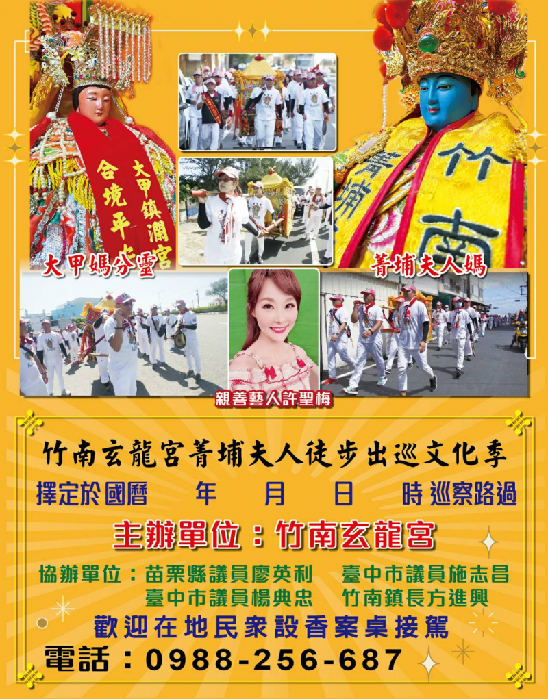 今年的玄龍宮四媽菁埔夫人將於4/28-5/2 展開為期五日的徒步出巡,許多藝人、政要都將跟隨四媽菁埔夫人出巡巡訪民間、驅邪化煞、賜福於民。