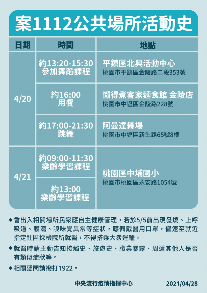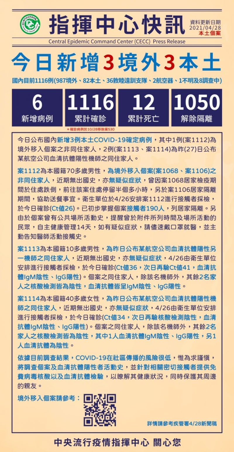 指揮中心表示,案1115、案1116為印尼籍20多歲女性及20多歲男性,今(2021)年4月11日一同來臺就學,持有搭機前3日內檢驗陰性報告,入境後由校方安排住所進行居家檢疫,期間並無症狀;4月26日檢疫期滿後,經校方安排專車至醫院採檢,於今日確診(案1115:Ct值32;案1116:Ct值30)。已掌握2人同車接觸者15人,均有適當防護,列自主健康管理。