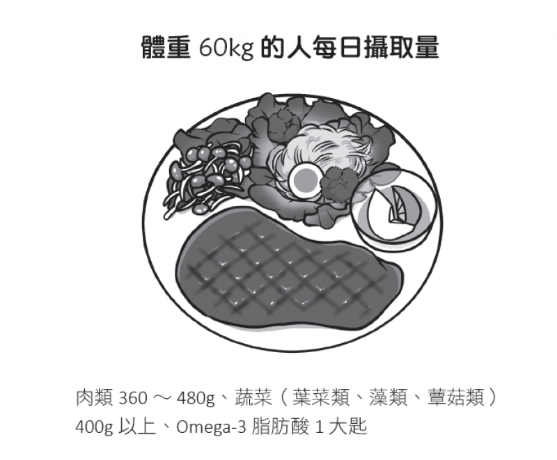 蛋白質的每日應攝取量相當於每1公斤體重換算1.2克∼1.6克蛋白質。但要注意的是,肉類100 克並不等於蛋白質含量100 克(請參照P147)。一個體重60公斤的人,每日須攝取72∼96克的蛋白質。由於肉類或魚類淨重量大約百分之二十是蛋白質量,換算成食品重量約為360 ∼ 480 克。一天分數次攝取可提高吸收利用率,但切記這並非數字加總遊戲,也必須同時監控除脂肪體重。