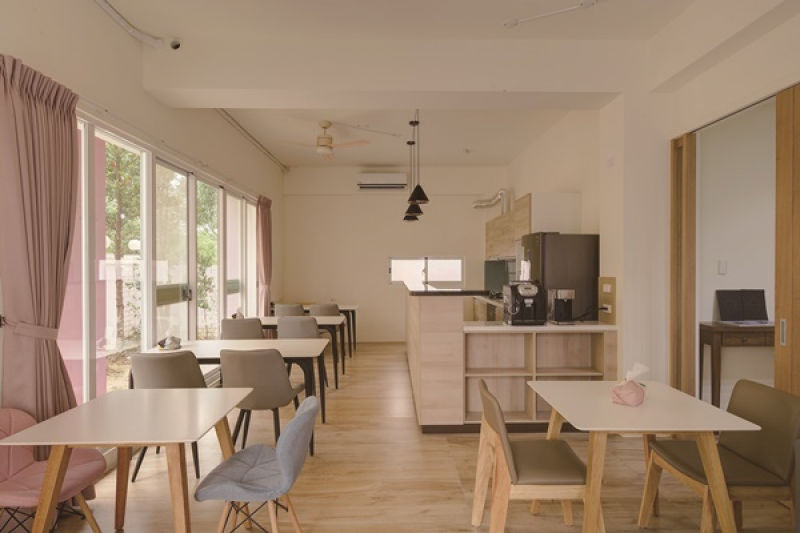 一樓的公共區域,同樣呈現現代簡約風格,讓旅客就好像待在家一樣舒適,空間配置有交誼廳、廚房、冰箱,非常適合全家親子旅遊、家族聚會、朋友出遊等,更歡迎包棟獨享,完全獨立不受外人打擾。在這裡,有任天堂經典紅白機可恣意暢玩打電動,或是叫外送也很方便,還是外帶食物回來(廚房餐盤可使用,但不能開火),大夥一起喝酒、品茗輕鬆聊天。另貼心提供小朋友專屬的遊戲本及拼圖遊戲,亦或溜小孩至夢幻島上有一座彩繪戲水池,夏日時可玩水消暑,更增不少親子互動樂趣,讓大人們很放心。