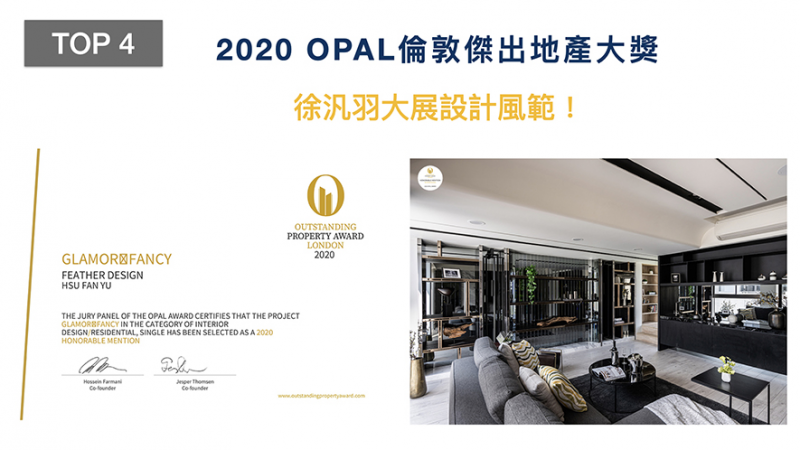 英國倫敦傑出地產大獎The OPAL Award,旨在表彰地產開發、建築設計和室內設計的傑出人才;羽築設計於作品《隱.敘》注入華人風水文化,以開敞的法手,延伸透視感,獨特的設計手法獲得賽事Honorable Mention 獎項,讓迷人的設計展演於國際舞台!
