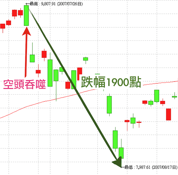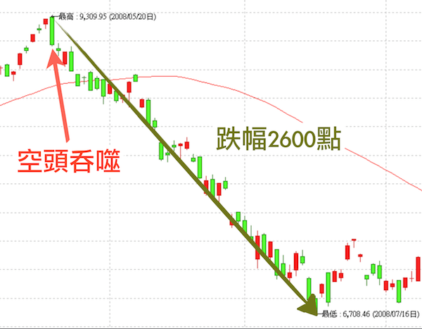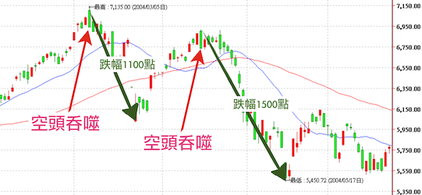 3.空頭吞噬也是一種烏雲罩頂,只是條件更嚴格,因為烏雲罩頂只要求黑k跌到前一天k棒的一半以下,吞噬是要求要整根k棒都要吃掉才算,所以是比烏雲罩頂更強的空頭訊號。