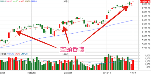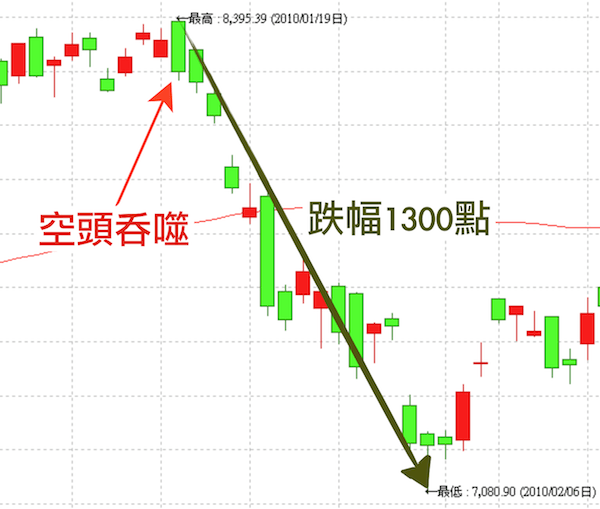 2.個股出現空頭吞噬操作方法也類似,尤其是漲多又高檔有爆量過的就要特別小心,但是個股出現例外的情況比大盤多;