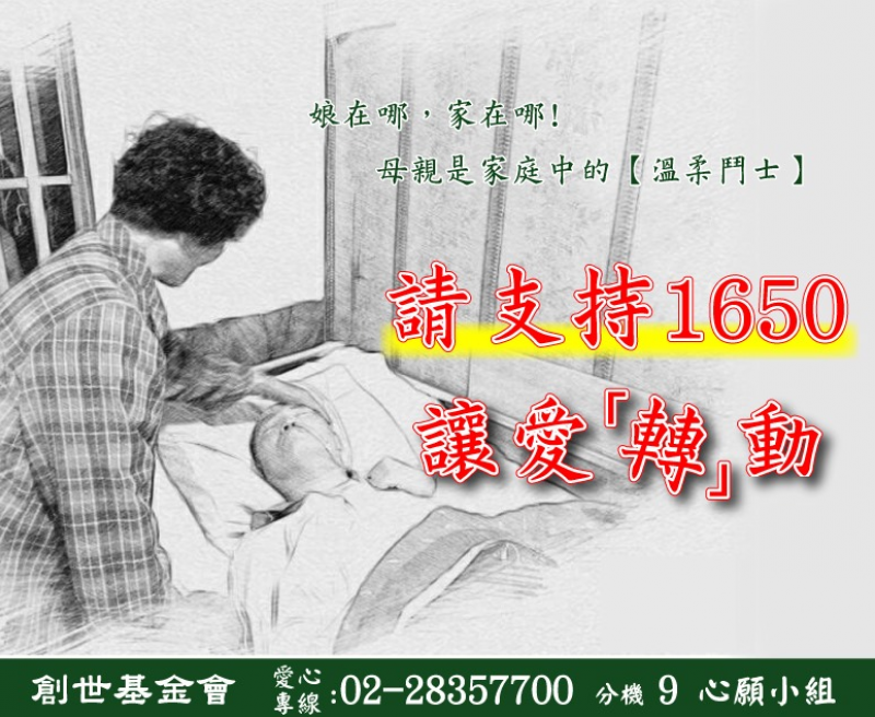 創世基金會長期耕耘清寒家庭植物人照護,目前安養約800位植物人,免費提供2,000多位植物人家庭到宅服務。照顧一位植物人每天約需10片尿布,盼社會大眾每天存10元,每月300,集十行善,愛不間斷。愛心專線:(02)2835-7700分機9心願小組。