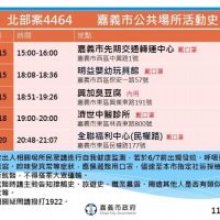 市長黃敏惠表示,案4464為居住在新北市50多歲女性,5月15日搭國光客運於15:00-16:00間抵達嘉義市先期交通轉運中心(全程戴口罩),由親友開車接送,18:08-18:36至本市保安一路明益嬰幼玩具館(有戴口罩),18:51-19:26至興業東路興加臭豆腐於店內用餐;5月18日19:00-20:00因長期肩頸痠痛至林森東路濟世中醫診所就醫,個案、診所醫護人員及候診民眾均有佩戴口罩;5月20日20:48-21:07至民權路全聯福利中心(全程戴口罩);案5月15日南下時即有咳嗽症狀,其他時間多在家,後因咳嗽持續及腹瀉5月22日由親友開車就醫採檢,5月24日確診,判斷染疫地點在新北市。