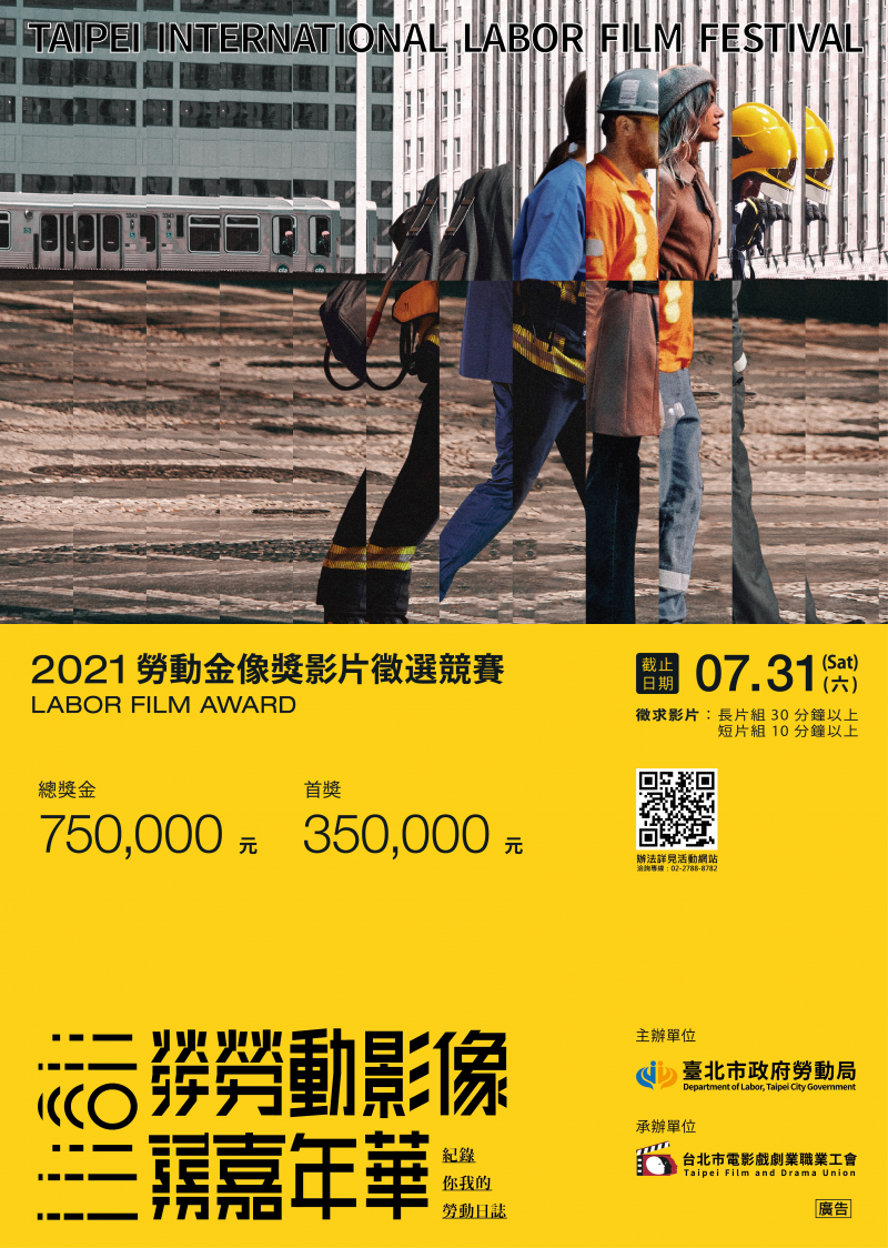 勞動金像獎的獲獎作品也將在影展期間放映,首獎獎金35萬元,競賽總獎金更高達75萬元,徵件項目共分為30分鐘以上長片組及10分鐘以上但未滿30分鐘短片組,凡民國107年至110年7月31日間完成拍攝之影片,與勞工核心議題相關題材之影像作品,即日起至7月31日止,歡迎報名參加。