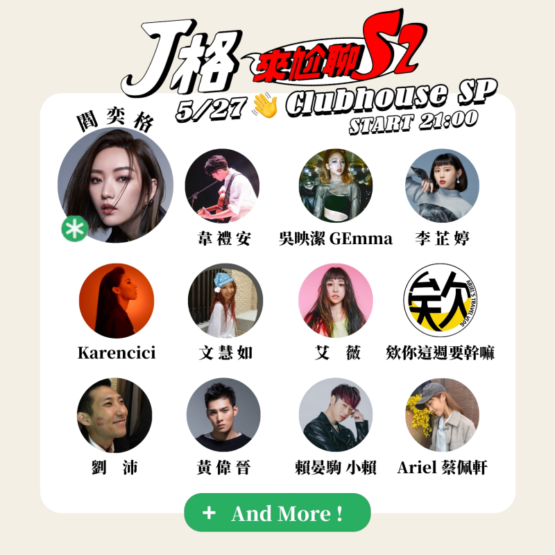 閻奕格的Podcast節目「J格來尬聊」第二季,昨天驚喜推出特別企劃,邀請眾多過往節目嘉賓與好朋友們,一起在Clubhouse開房尬聊,線上收聽人數最高達4300多人。好友們包含韋禮安、黃偉晉、艾薇、吳映潔、孫盛希、Karencici、宇宙人小玉、魏嘉瑩、文慧如、Ariel 蔡佩軒、李芷婷、嘻小瓜、李佳歡、木木林葦妮、歐馬克、吳瑪麗、Youtuber劉沛、小忍李洹宇,以及欸你這週要幹麻的Ariel、Shine、阿弟,總共21位好朋友一起聊天,眾星雲集,氣氛熱鬧翻騰笑料百出,不僅全體角色扮演合唱「手牽手」、也一起玩遊戲,更大聊居家防疫生活日常與美食。