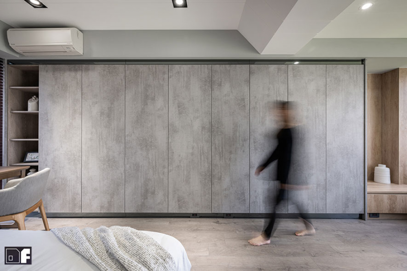 ▲起居室床頭設計,捨棄舊有四方木製,改以繃布搭配石紋系統板材,透過統一色系的鋪陳,保留材料本質的純粹,拉出空間裡的溫柔面。