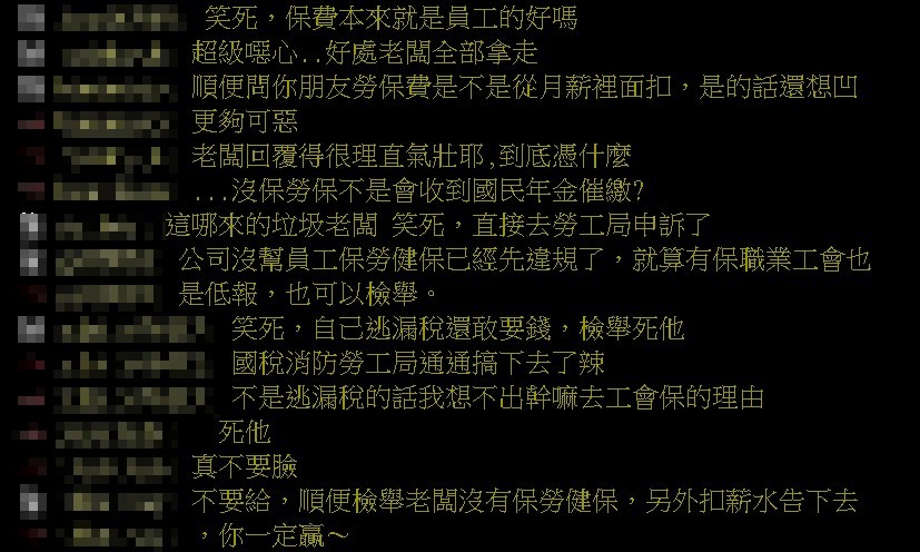 一名網友昨(9日)在PPT發文分享,自己的朋友在高雄是從事送餐、洗碗的勞工,月薪大約3萬,好不容易成功領到紓困金,卻被老闆要求「上繳紓困金」。原PO表示老闆並沒有幫員工繳勞健保,而是把員工加入職業工會,老闆認為「職業工會的保費是雇主繳的,所以紓困金也該給雇主」,還表示:「趕快上繳,下個月薪水就會很快入帳」。對此網友都非常氣憤,表示:「公司沒幫員工保勞健保已經先違規了,就算有保職業工會也是低報,也可以檢舉。」、「笑死,自己逃漏稅還敢要錢,檢舉死他!」。