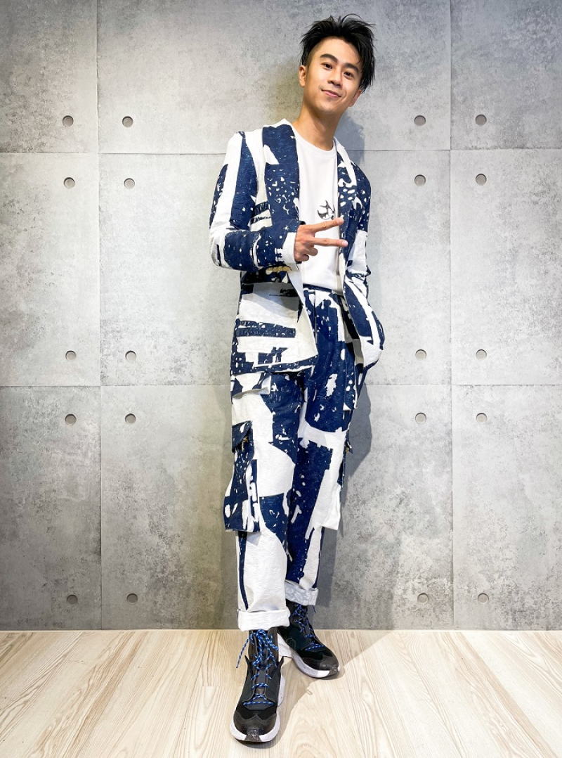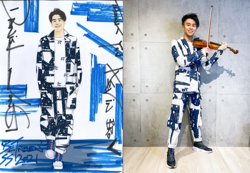 接著提到當他收到服裝,Daniel Wong也附上親筆手繪設計的手稿圖,廖柏雅興奮地表示:「我最喜歡這樣的物品,因為設計圖最能表現出一個藝術家當下在創作時候的溫度。」,而身上的服裝亦融合了復古、拓印、解構、拼接等元素外,也大量的加入春燕的圖騰,春燕意味著希望和幸福即將到來,期許在這疫情期間,帶給人們希望和幸福的象徵。除此之外,腳上的這雙鞋,巧妙融合了跑步鞋、球鞋、牛津鞋的個別特色外,最讓他驚喜的是,鞋底是運用環保材料製作,這是一雙兼具時尚、實用又環保的鞋。