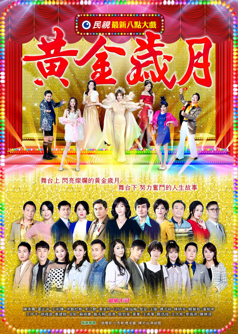 民視今天(15日)公開八點檔接檔大戲《黃金歲月》全新主視覺,台灣天后陳美鳳華麗站在舞台C位,王彩樺、王中平、洪都拉斯、陳仙梅、葉家妤、賴慧如著秀服一字排開,以及第一波卡司全員亮相,讓那段「台灣錢淹腳目」,人人開心忙著賺錢的「黃金歲月」格外令人期待!海報寫著舞台上閃亮燦爛的黃金歲月,舞台下努力奮鬥的人生故事,預告著戲劇將發生的故事,將讓觀眾們更有共鳴。