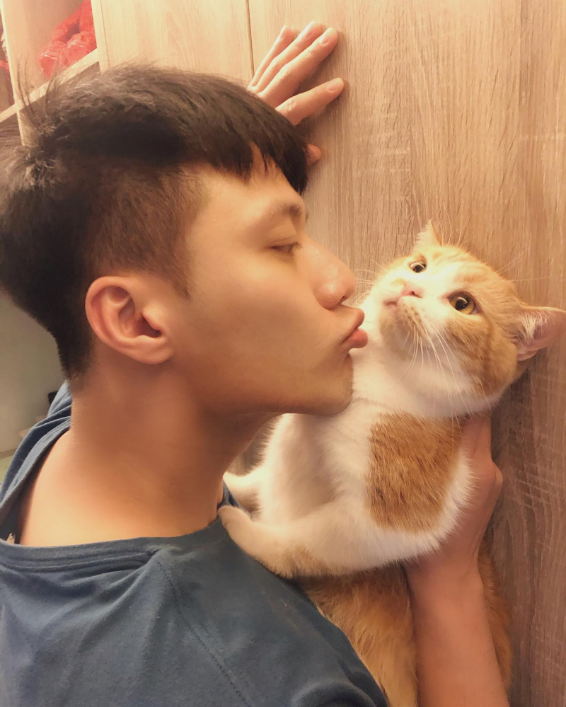 而提到老二,唯一的一隻母貓「泡芙」,天生基因有缺陷,骨頭比較脆弱。兩年前,隔天要出國做宣傳,連行李都沒有準備。要去運動的時候,從「泡芙」後面的背影發現,左後腿怎麼在晃,感覺骨頭是斷的,整個嚇傻,幸好找到找有幫動物做骨科手術的醫院。醫生熱心的講解手術過程:「這個手術很不好做,左後小腿的一小節,斷了三個地方。且前後斷掉地方,離關節非常近,上下螺絲不好鎖。」把牠安置進去整理完行李,晚上再去看「泡芙」。在籠子裡,我看到牠,牠也看到我,想站起來,眼睛都是濕的。張睿家感性的說,當下我就哭了,因為很不捨。那一次印象真的很深刻,很幸運的是,後來泡芙的腳也痊癒了,可以正常走路。