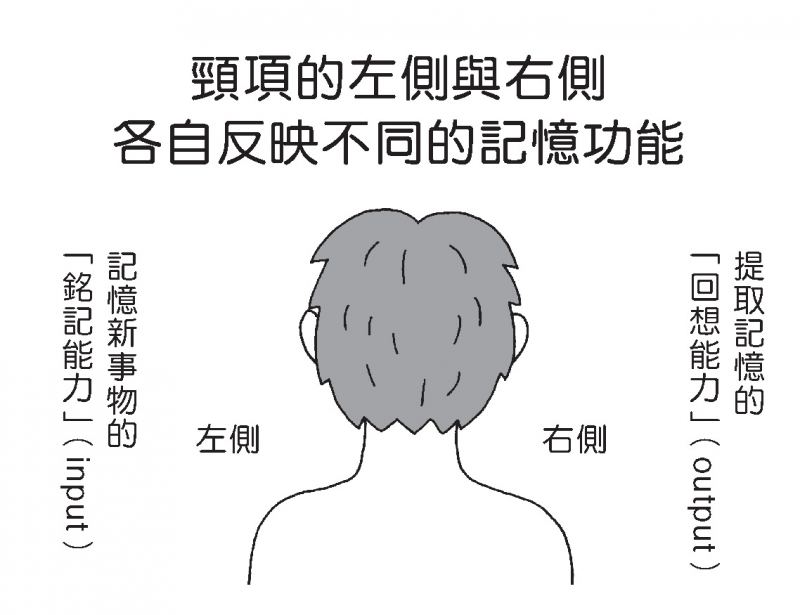 具體而言,頸子的右側關係著提取記憶的「回想能力」(output,記憶輸出能力),頸子的左側關乎記憶新事物的「銘記能力」(input,記憶輸入能力)。