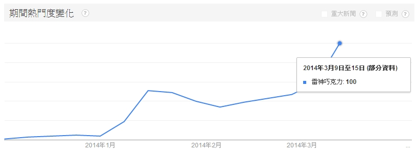 我想這大概是跟雷神巧克力『便宜又大碗』的定位有關,畢竟女孩兒在心儀的日子要送前輩『本命巧克力』可是會精心挑選巧克力的(有些甚至會自己做),而這種低價的巧克力就不被納入挑選範圍了,也因此2月中並無提升的跡象。而3月中爆高量當然還是因為義理巧克力的關係了,作為回送需要的巧克力,便宜好吃的雷神巧克力再次成為了不二人選!也因此在三月中再度成為爆發期。