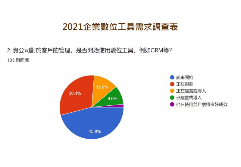 本次活動也針對北中南134家業者需求進行調查,發現僅有3%業者在「接觸新客戶」時未使用數位工具,但近50%的業者在「客戶管理」、「網站行銷」、「商品開發」、「商品管理」時未使用數位工具,且在「客戶的服務」、「網站呈現」、「交易結單」時未使用數位工具的業者也有近60%。本次調查結果匯整,業者在導入數位工具的主要原因,前三名分別是「提高行銷精準度85.1%」、「開拓新市場73.9%」、「提升顧客體驗73.1%」。