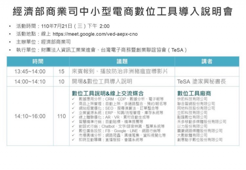 【編採中心/台北報導】隨著網路與科技的發展,數位化是企業前進的必然之路。為協助網路零售業者升級、活用數位工具,經濟部商業司「網路購物環境健全發展計畫」委託財團法人資訊工業策進會與台灣電子商務暨創業聯誼協會(TeSA),彙整了10種以上數位工具資訊與廠商,並於7月21日舉辦「經濟部商業司中小型電商數位工具導入說明會」,要幫助業者認識各種數位工具,以及輔導找尋適合的數位工具來導入。