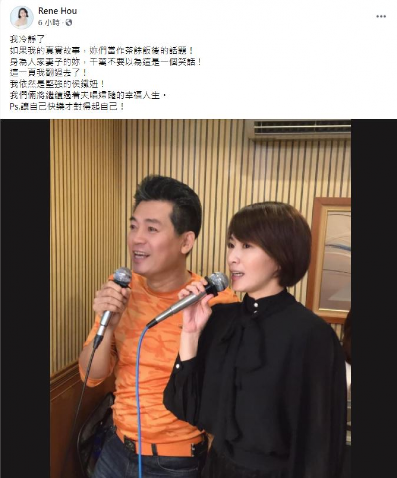 侯怡君今日凌晨1點多在臉書貼出和蕭大陸的照片,表示自己已經冷靜了,直言:「如果我的真實故事,妳們當作茶餘飯後的話題!身為人家妻子的妳,千萬不要以為這是一個笑話。」侯怡君收起暴走的言論,坦言這一頁已經翻過去了,「這一頁我翻過去了!我依然是堅強的侯鐵妞!我們倆將繼續過著夫唱婦隨的幸福人生。」並在文末強調,讓自己快樂才對得起自己。