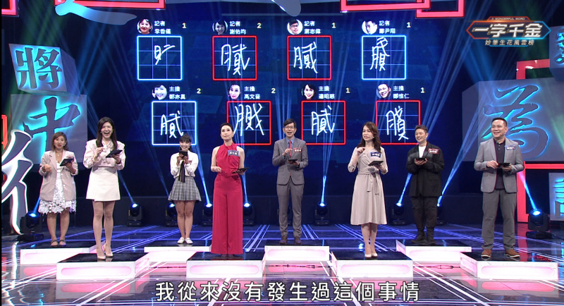 《一字千金妙書生花風雲榜》主播與記者PK 大合照:左起《公視早安新聞》主播鄭惟仁、中天新聞主播鄭亦真、華視新聞主播連昭慈、年代新聞主播高文音、主持人曾國城、TVBS醫藥線資深記者蔣志偉、三立新聞網娛樂線記者鄭尹翔、東森新媒體記者謝佑昀、中天新聞社會線記者李香儀
