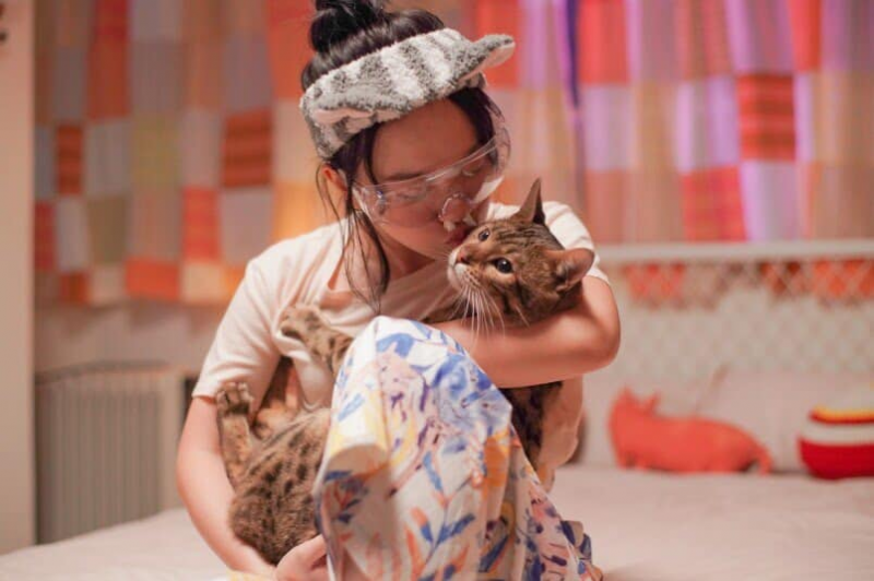 她笑著說,因為媽媽很怕電影中的「九命怪貓」,所以我的成長過程中沒有貓咪。有一幕真的很震撼,貓咪熱情到「舔到自己的胸部」,真的很驚嚇,後來才知道這隻貓咪是睿家飾演的老闆「雷昊陽」,是不是超級變態的(笑)