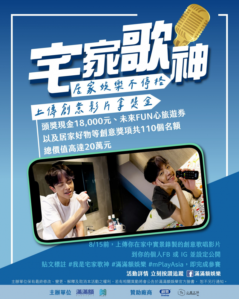 即日起到8/15,上傳你在家中實景錄製的1分鐘內創意歌唱影片到個人FB 或 IG 並設定公開,貼文標註 #我是宅家歌神 #滿滿額娛樂 #mPlayAsia,即完成參賽。