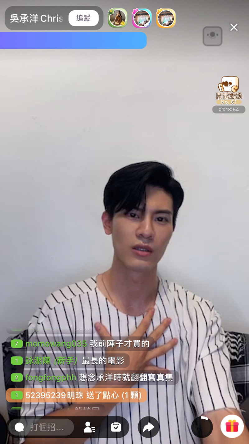 BL劇男神「黑道少主」吳承洋,防疫期間忙著為新作品做準備,為了一解粉絲們想念跟大家好好聊天,攜手17LIVE跨界挑戰直播線上分享近況,吳承洋一上線吸引台灣之外新加坡、馬來西亞、香港、泰國、日本、韓國、菲律賓等各地粉絲也紛紛湧入,很多外國粉絲留言寫英文韓文日文都有,有粉絲英文寫想為了更瞭解吳承洋而學中文,或希望他能講日語或法語,粉絲熱情打招呼互動提問,還有直接告白喊「哥哥我愛你!」