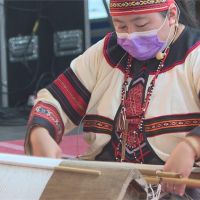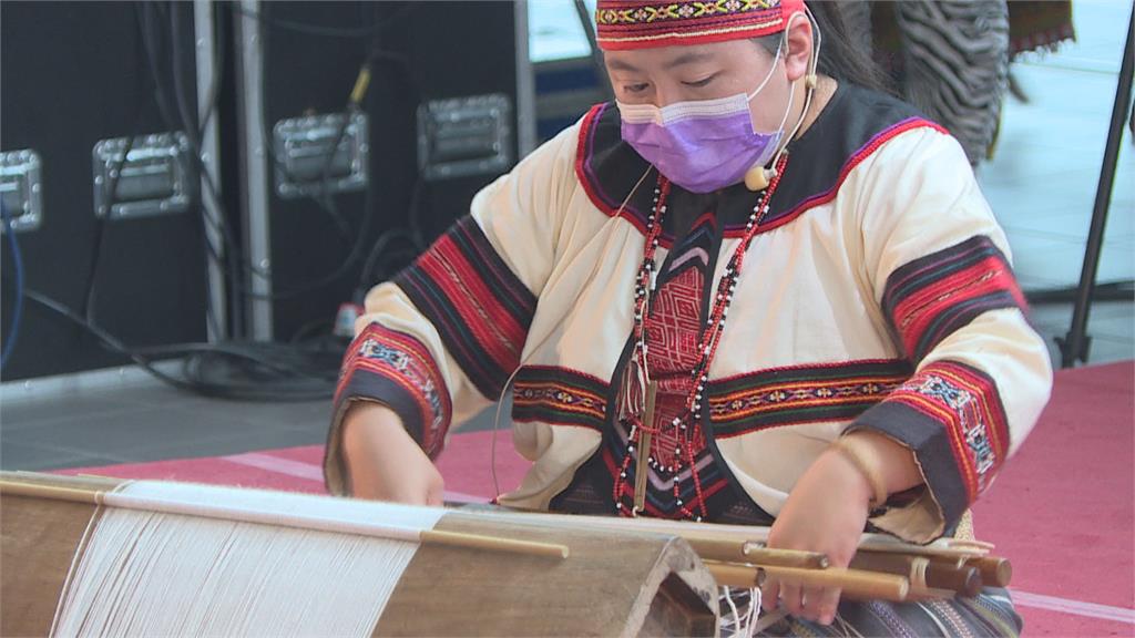 舞台上,穿著原住民服飾的表演者,使用著傳統的編織器具,演繹著編織技藝與手法,而從服飾圖騰中發現,原住民族群,和客家族群交流的歷史。