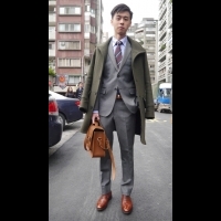 「我是剛從企管系畢業的新鮮人;平常就喜歡英倫風格的紳士裝扮,因為我的身型偏瘦,即使已是日系的Takeo Kikuchi的西裝也都需要再改,所以我平常居多都是穿訂製西裝。」 西裝;襯衫;領帶,都是Takeo Kikuchi。 Yellow Tree大衣。 John Lobb皮鞋。 Cambridge Satchel劍橋包。
