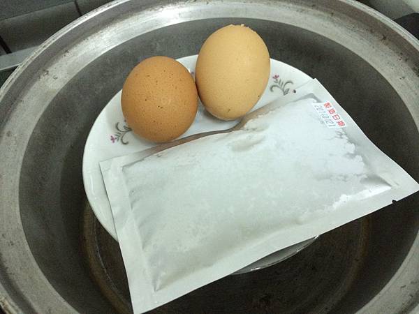 2.將滴雞精和蛋瞉放入電鍋加熱(鍋外半杯水)