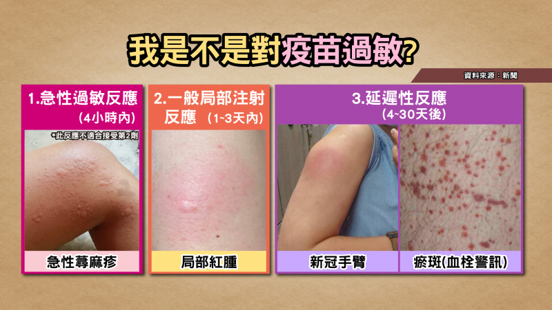 由於急性過敏性反應幾乎都是發生在施打後半個小時之內。林氏璧建議注射疫苗過後,至少在接種場所原地觀察15分鐘;若曾有食物或藥物等嚴重過敏史,則建議原地觀察30分鐘。若出現「過敏性休克」相關症狀,則「不適合」再接受第同種的2劑疫苗注射。其他一般注射局部的反應,像蕁麻疹或者一些延遲反應,像是起紅斑、瘀斑等等,就沒有一定需要改打其他疫苗,但他也強調,因為每個人狀況可能不一樣,施打前還是建議請醫生協助判斷瞭解。