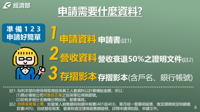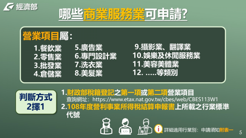 至於有哪些行業可以申請?經濟部表示,包括餐飲、零售、批發、倉儲、廣告、設計、洗衣、美髮、攝影、翻譯、娛樂及休閒服務業、美容美體等類別。申請時須準備符合商業服務業之證明,載明投保單位保險證號,符合艱困要件之下列衰退及比較月份之證明文件,申請事業存摺影本(含事業名稱、銀行分行、帳號)等資料。