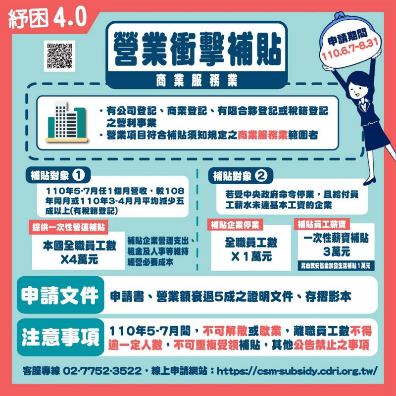 該補助條件,針對有稅籍登記的商業服務業,只要在110年5、6、7任何一個月份,營業額減少達50%者,將提供一次性營運補貼,以本國全職員工數計算,每人4萬元