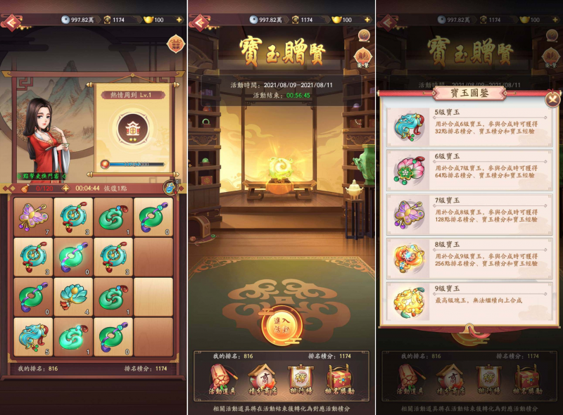 每次合成寶玉皆可獲得寶玉經驗、寶玉積分及排名積分,積分可以用在積分商店中換購多種道具,而寶玉共分為0~9級,合成出越高級的寶玉所獲得的寶玉經驗和積分就越多,而且活動結束後,寶玉積分還可以保留到下次活動開啟後再使用喔!