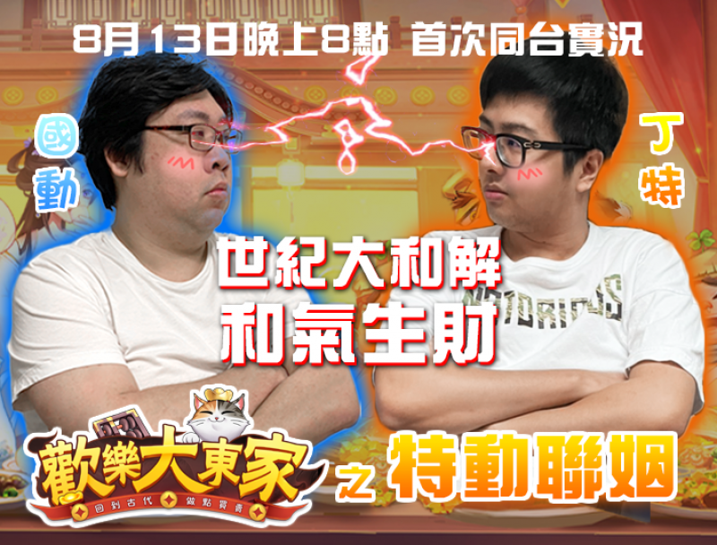 另外兩大遊戲實況主丁特與國動也將在本週8/13(五)晚間20:00聯合實況,深入體驗《歡樂大東家》內更多有趣的內容,這也是兩人多年來第一次正式同台實況,大家可以一起來觀賞這場精采的世紀大和解。立刻來下載遊戲並關注粉絲團,一起來圍觀這檔好戲吧!