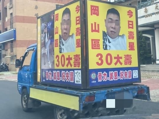 一名網友在「爆廢公社公開版」臉書貼出影片,只見高雄街道上出現一輛廣告車,看板上寫著「岡山區今日壽星,30大壽,骨力(台語:勤勞)、誠懇、好央請(台語:很好請託)」,上頭還有壽星的照片,穿梭在街頭巷弄,讓民眾不禁投以好奇眼光。