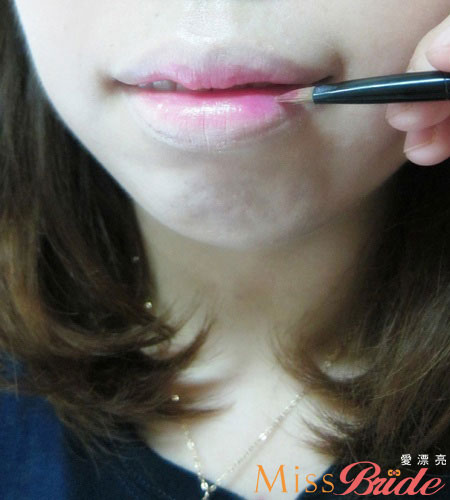 再來,將桃紅色唇膏的邊緣用唇刷輕輕刷暈,使之融合,