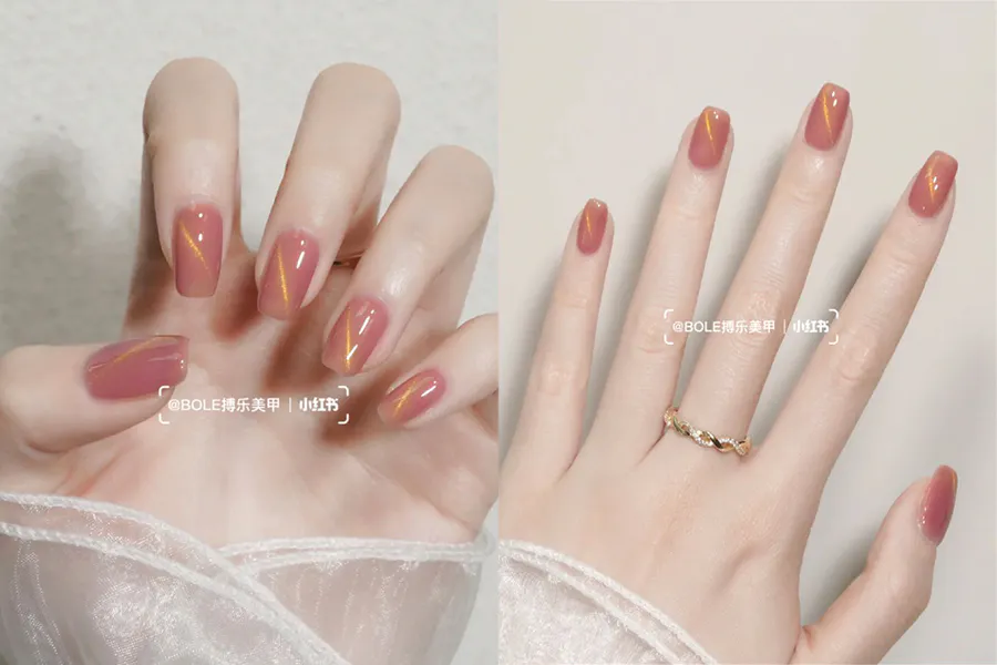 害怕貓眼太過閃耀顯黑,不如從一道貓眼蜜桃粉入門,簡單點綴一條金光貓眼,搭配顯白的蜜桃粉,又可愛又氣質。