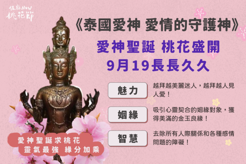 保庇NOW與泰國愛侶灣四面佛(台北)合作的脫單計畫「保庇NOW桃花節-緣之呼吸招桃花攻略」,已經甜蜜登場,想隨時掌握最新資訊,別忘記追蹤保庇NOW臉書社團,讓保庇陪你一起守護愛情。(編輯:保庇NOW)