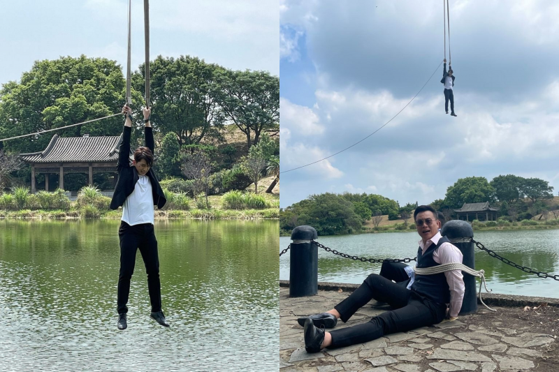 此外,高吊空中身體難以控制,無時不刻被風吹得打轉,每當身體打轉背對鏡頭,他就得臨場發揮加「快放了我、你好可惡」等碎詞,直到轉向鏡頭,才抓緊時間念出台詞,大量體力活讓他自嘲「簡直在拍武打戲」。