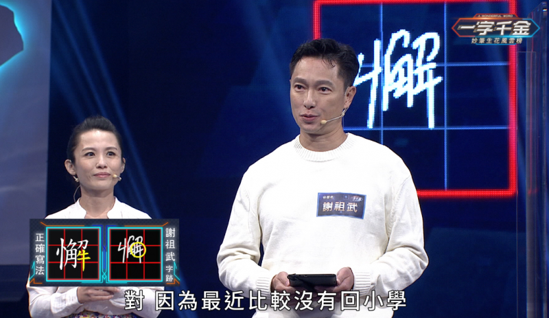 到了第三題「角刀心牛」組成一字「懈」,馬力歐看到正解很嘔的說:「都已想到是『解』,但是怎麼會多個心?!完全沒想到是豎心旁! 」謝祖武好不容易寫出來,看似可以搶下2分,沒想到卻因右下方部件寫法已改「牛」的寫,與得分擦身而過,演員組四位全部「掛蛋」。