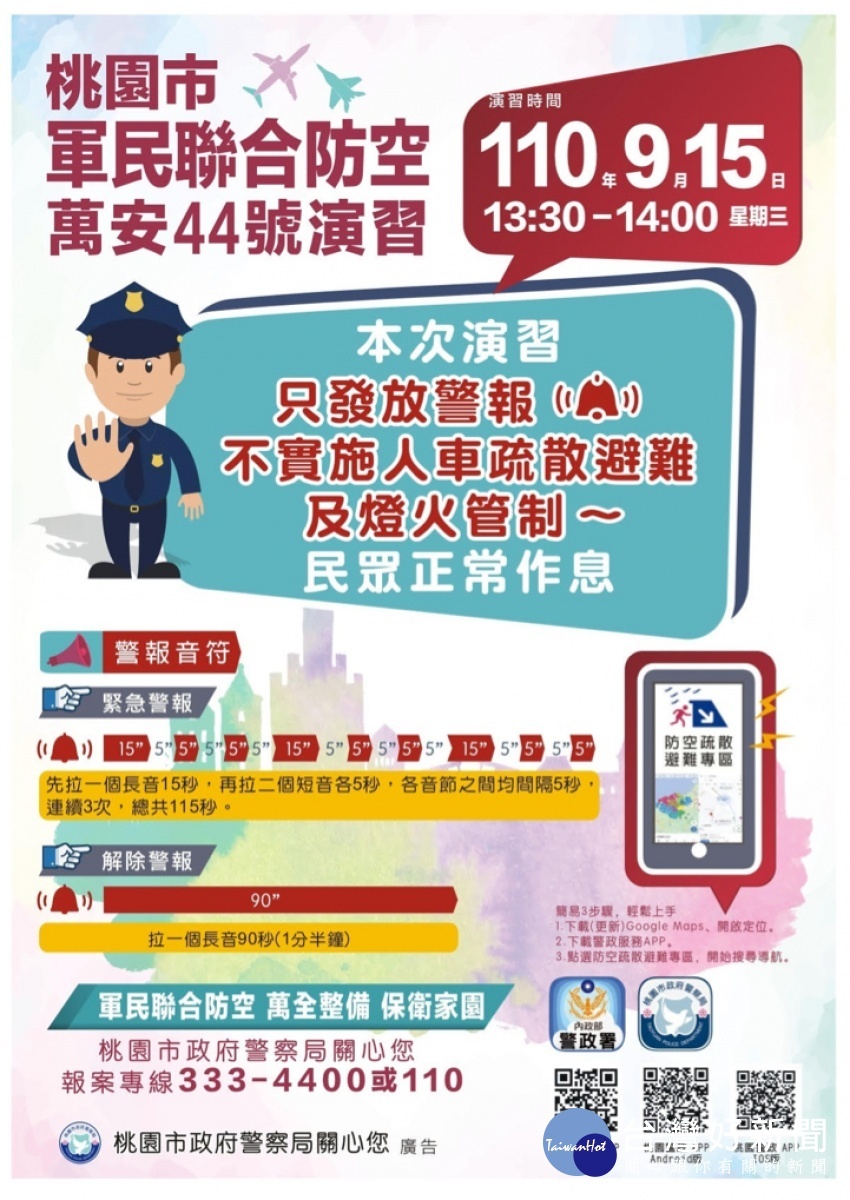110年軍民聯合防空「萬安44號」演習,訂於9月15日(星期三)下午1時30分至2時舉行。桃園市警局表示,演習只發放防空警報,不管制燈火,不實施疏散避難,所有車輛及行人不實施管制,各機場、港口之飛機、船舶暨鐵路、高速鐵(公)路及捷運車輛,均照常起降、靠離與行駛。